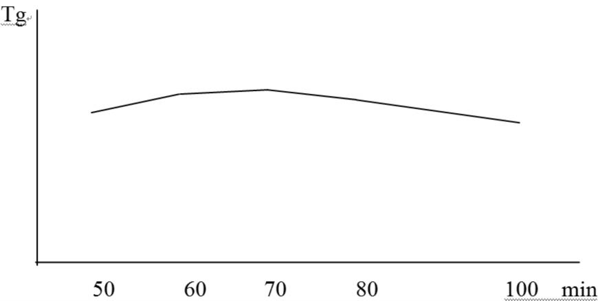 產品層壓過程固化時間對基板的Tg 的影響,與固化溫度相類似。我們做了以下試驗:在相同固化溫度與層壓壓力下,不同固化時間對基板Tg 影響的對比試驗。層壓固化時間分別取50min,60min,70min,80min,100min,采用相同的層壓壓力,保溫時間都是60min。我們發現基板的Tg 在固化時間70min 時為最高(見圖67)。時間低于60min,由于基板固化不充分,所以其Tg 偏低;時間高于80min,樹脂將開始出現降解,溫度越高,降解現象越嚴重,所以其Tg 偏低。從圖上看,固化溫度對基板Tg 的影響明顯大于固化時間。