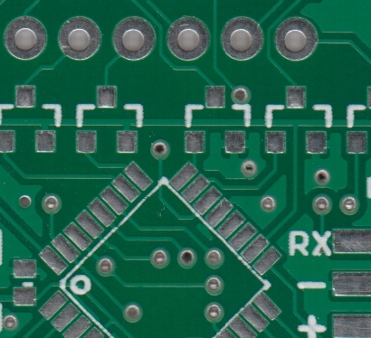 在下面的示例中,綠色焊接掩模應(yīng)用于PCB板的大部分,覆蓋小的跡線,但留下銀環(huán)和SMD焊盤(pán)暴露,以便它們可以焊接到。